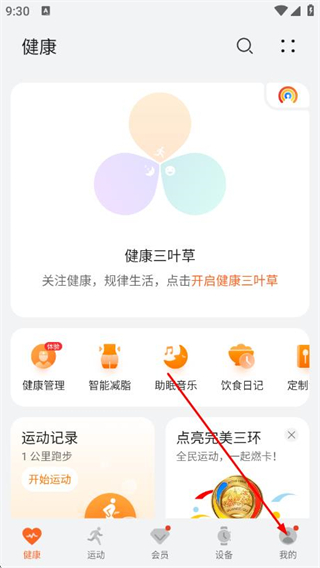 1、打開華為運動健康App,進入首頁,點擊底部導航欄最右側(cè)的我的選項,進入個人中心頁面。
