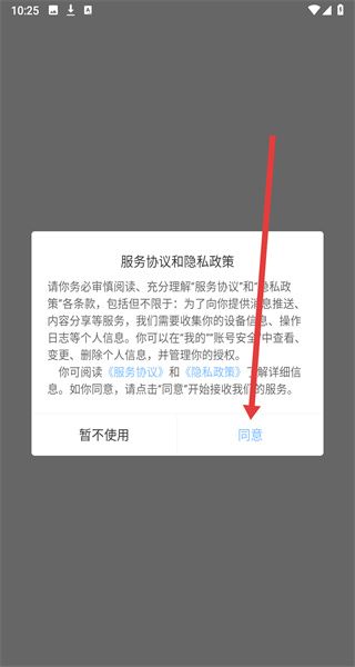 1、點(diǎn)擊“服務(wù)協(xié)議和隱私政策”彈窗的“同意”,進(jìn)入APP主界面。