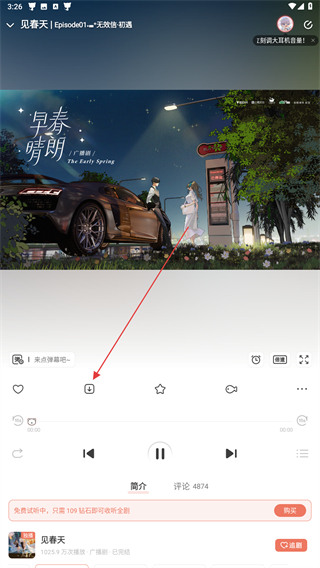 2、在廣播劇的播放界面,需要點擊彈幕開關(guān)的圖標(biāo),彈出彈幕設(shè)置的面板。