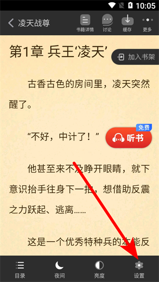 3、在閱讀界面點(diǎn)擊屏幕中間位置,再點(diǎn)擊底部的設(shè)置選項(xiàng)。