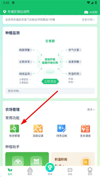 1、打開MAP智農(nóng)APP,在首頁的農(nóng)場管理常用功能中,點擊地塊管理選項。