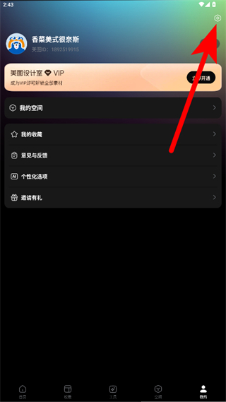 1、打開美圖設計室應用,點擊底部的我的選項,進入個人頁面后點擊右上角的設置圖標。