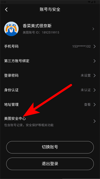 4、在賬號與安全頁面點擊美圖安全中心。