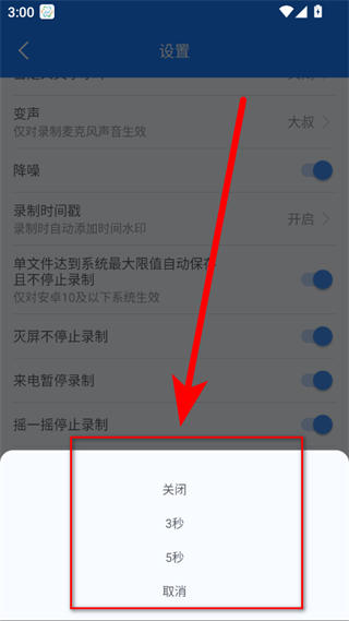 4、在選擇框中選擇3秒或5秒,即可開啟EV錄屏的錄屏倒計時拍攝功能。