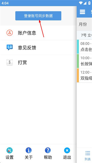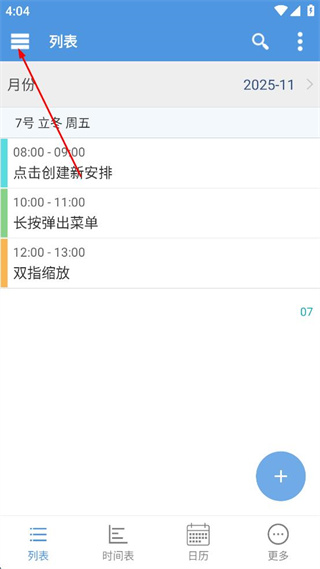 1、打開(kāi)日程管理APP列表頁(yè)面,點(diǎn)擊左上角菜單按鈕展開(kāi)側(cè)邊欄。