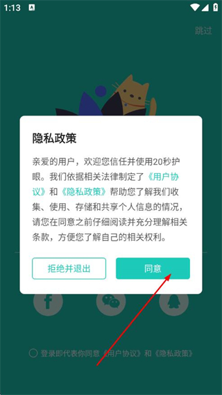1、打開20秒護(hù)眼APP,在隱私政策提示框中點(diǎn)擊同意。