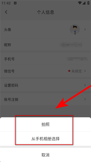 4、彈出選項框后,選擇拍照或從手機相冊選擇,即可完成更換。