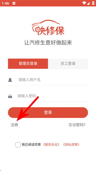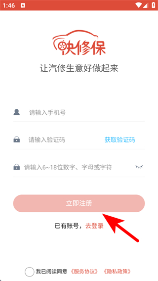 1、打開(kāi)快修保APP,我們需要在登錄界面點(diǎn)擊注冊(cè)。