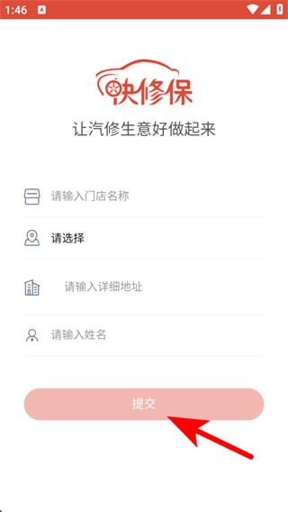 3、進(jìn)入完善信息頁(yè)面,輸入門店名稱等信息點(diǎn)擊提交,完成注冊(cè)。