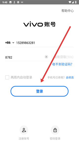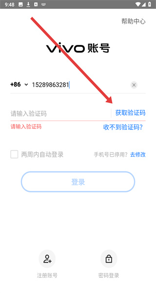 3、在跳轉(zhuǎn)到vivo賬號(hào)登錄頁(yè)面,輸入好手機(jī)號(hào)后點(diǎn)擊獲取驗(yàn)證碼按鈕進(jìn)行登錄。