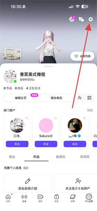 1、打開崽崽ZEPETO應用,點擊個人主頁右上角的設置圖標。