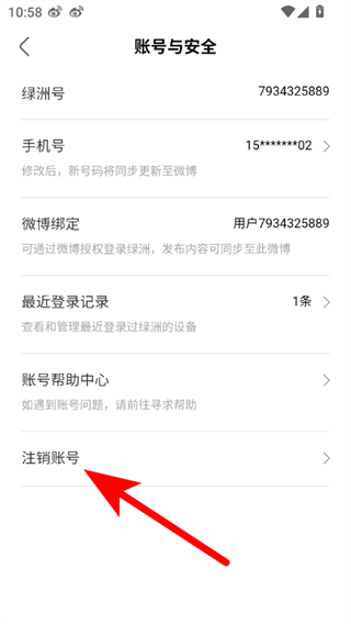 4、在賬號(hào)與安全頁(yè)面中找到注銷賬號(hào)選項(xiàng)并點(diǎn)擊,按照頁(yè)面提示完成驗(yàn)證等操作即可注銷綠洲賬號(hào)。