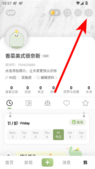 2、在個(gè)人頁(yè)面點(diǎn)擊右上角設(shè)置圖標(biāo),進(jìn)入設(shè)置功能列表頁(yè)面。