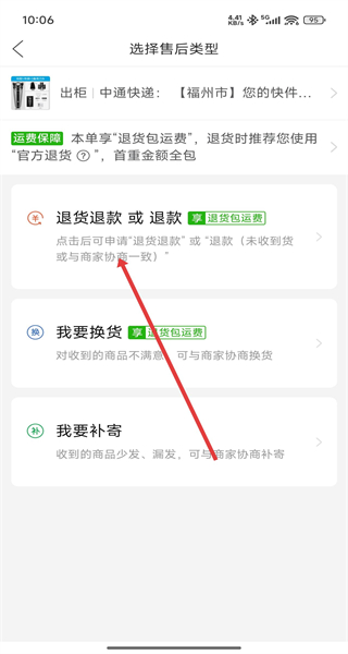 3、在選擇售后類型頁面中,可以點擊退貨退款選項,進行操作。