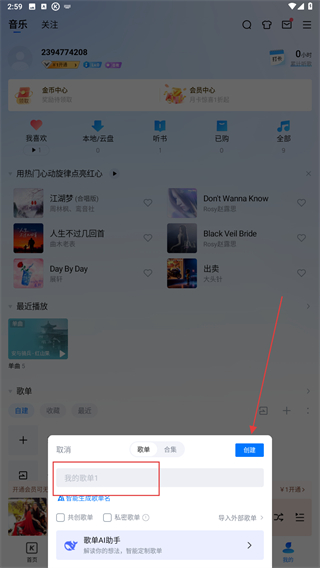 3、在輸入框內輸入歌單名稱后,點擊創(chuàng)建的按鈕即可。