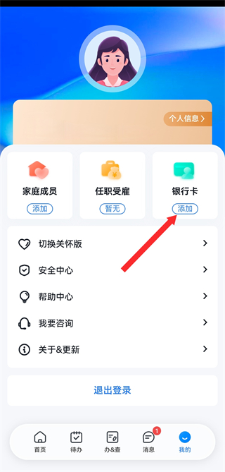 2、在個人頁面中,點擊銀行卡區(qū)域的添加按鈕,進入銀行卡頁面。
