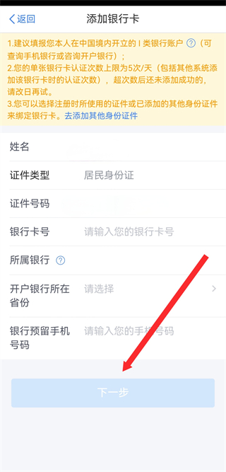 4、在頁面依次填寫信息,點擊下一步,按照提示完成銀行卡添加操作即可。