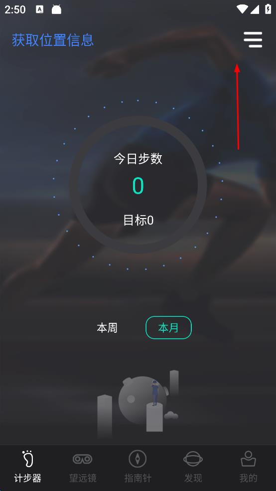 3、在計(jì)步器頁(yè)面,點(diǎn)擊右上角三條橫線的菜單按鈕,進(jìn)入相關(guān)設(shè)置界面。