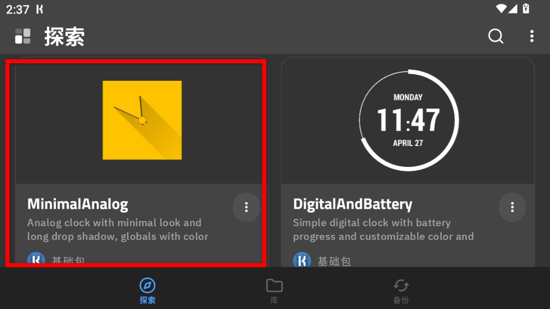 1、在探索頁(yè)面,點(diǎn)擊要添加的時(shí)鐘樣式如MinimalAnalog,進(jìn)入編輯界面。