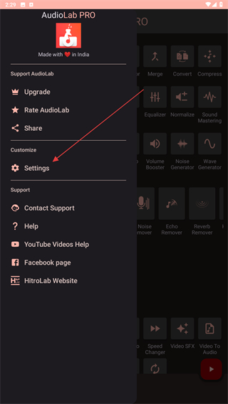 1、啟動audiolab的應(yīng)用,進(jìn)入首頁點(diǎn)擊左下角三個橫線的圖標(biāo)。