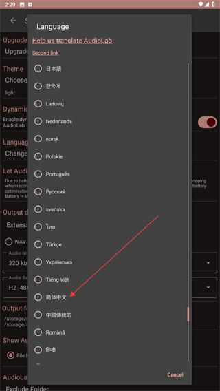 4、當(dāng)彈出語言選擇的頁面,向下滑動找到并點(diǎn)擊簡體中文即可。