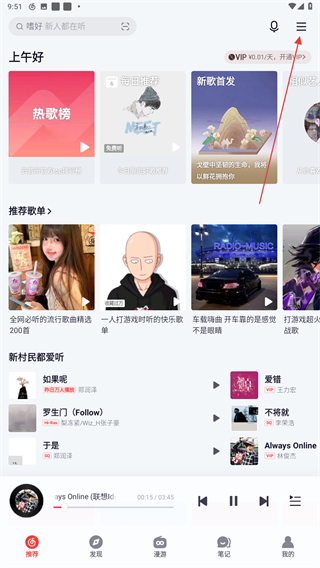 1、打開網(wǎng)易云音樂APP,進(jìn)入首頁點(diǎn)擊右上的功能圖標(biāo)。