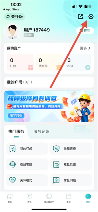 1、打開網(wǎng)上國網(wǎng)APP,點(diǎn)擊底部我的,進(jìn)入個(gè)人頁面后,點(diǎn)擊右上角的設(shè)置圖標(biāo)。