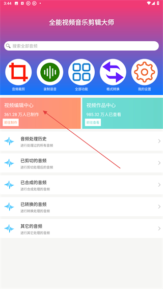 1、打開APP,進(jìn)入首頁點(diǎn)擊視頻編輯中心的按鈕。