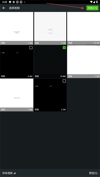 3、在選擇視頻的頁面內(nèi),選擇后點(diǎn)擊完成的按鈕。