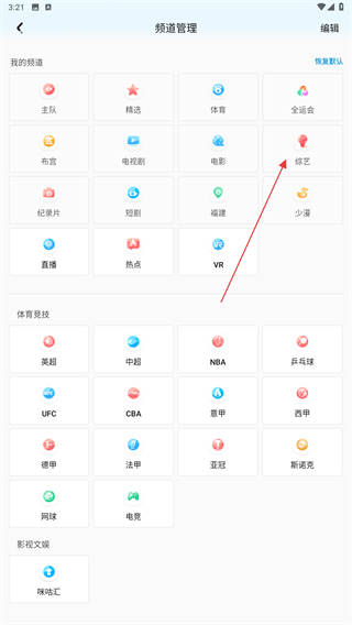 2、進入頻道管理的頁面內,找到并點擊綜藝的按鈕。