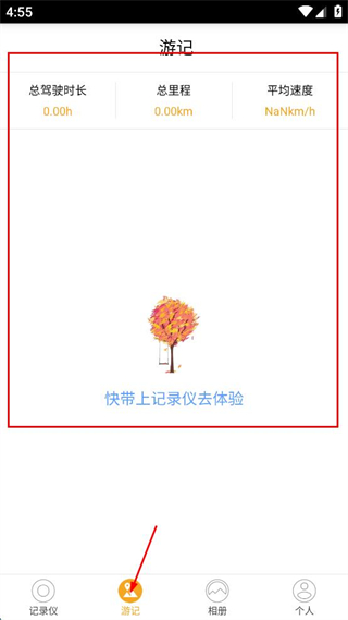 3、返回主界面點(diǎn)擊游記選項(xiàng),進(jìn)入游記界面查看駕駛相關(guān)數(shù)據(jù)。