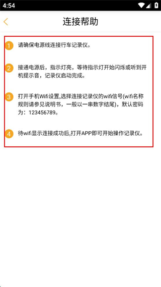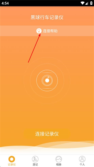 1、在APP主界面點(diǎn)擊連接幫助選項(xiàng),查看連接記錄儀的步驟說(shuō)明。