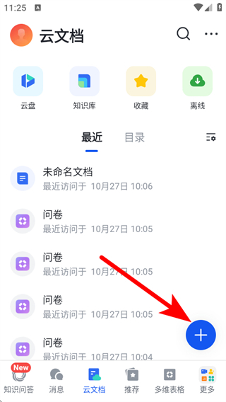 2、在云文檔頁(yè)面,點(diǎn)擊右下角的+號(hào),彈出創(chuàng)建選項(xiàng)列表。