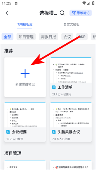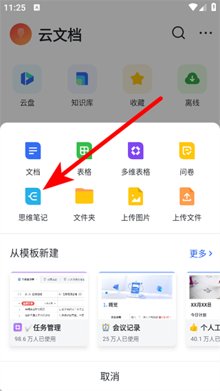 3、在創(chuàng)建選項(xiàng)中,點(diǎn)擊思維筆記,進(jìn)入選擇模板的頁(yè)面。