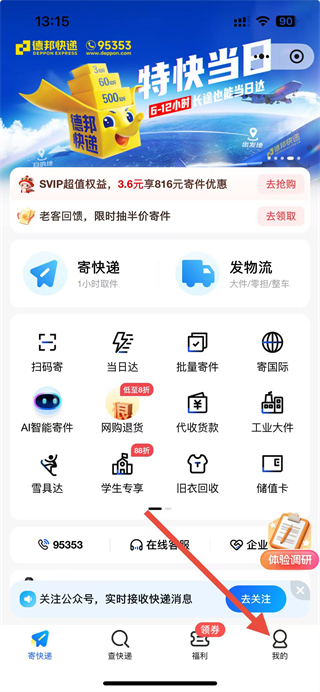 1、打開(kāi)德邦快遞APP,在首頁(yè)點(diǎn)擊右下角我的選項(xiàng)。
