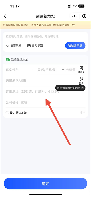 4、在創(chuàng)建新地址頁(yè)面,填寫(xiě)詳細(xì)信息,點(diǎn)擊確定按鈕即可完成收貨地址添加。