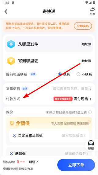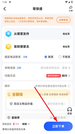 4、完善貨物信息,選擇付款方式,根據(jù)需求選擇保價(jià)服務(wù),確認(rèn)閱讀并同意,點(diǎn)擊立即下單,等待快遞員上門(mén)取件即可。