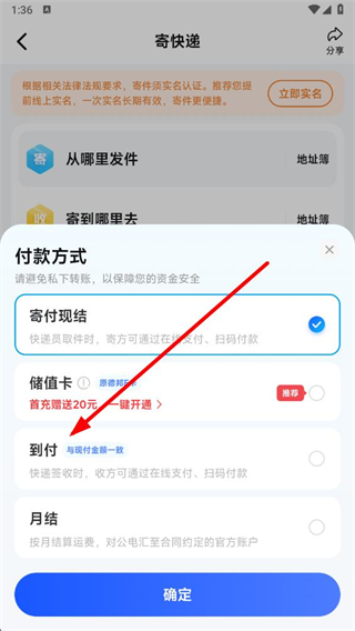 2、進(jìn)入寄快遞頁(yè)面后,點(diǎn)擊付款方式選項(xiàng)。