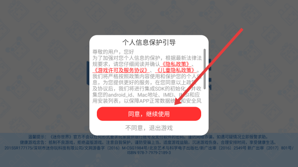 1、在打開迷你世界app后,通過點擊彈窗中的同意繼續(xù)使用按鈕,進(jìn)入使用。