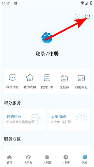 1、打開大象新聞APP,點擊底部導航欄中的我的進入個人頁面,點擊右上角設置圖標。