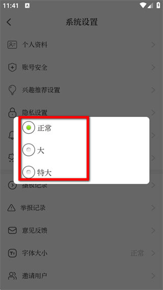 4、選擇正常、大、特大字號,即可完成大象新聞字體大小設置。