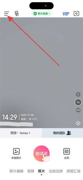 1、打開今日水印相機應(yīng)用,點擊左上角的三條橫線圖標(biāo)。