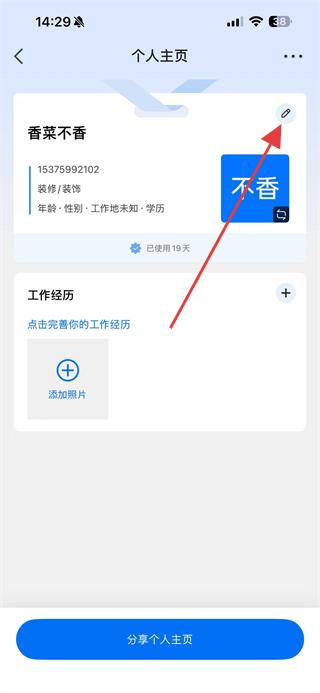 3、在個人主頁中,點擊編輯圖標(biāo)進(jìn)入編輯名片資料頁面。