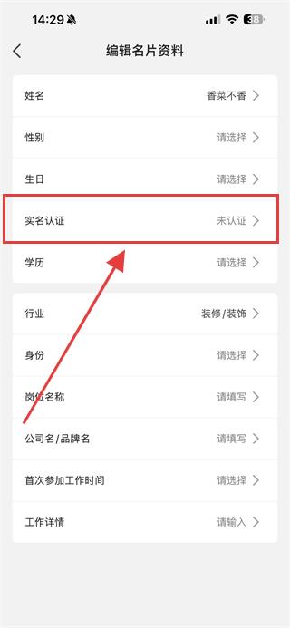 4、在編輯名片資料頁面點擊實名認(rèn)證。
