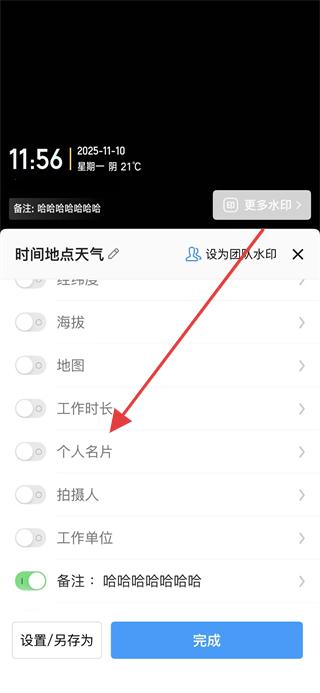 4、設(shè)置完成后,點擊完成,即可完成今日水印相機個人名片信息的添加。