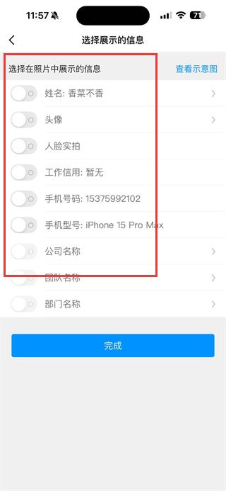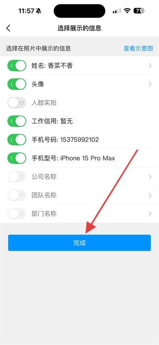 3、在選擇展示信息頁面中,開啟需要展示的信息如姓名、頭像、工作信用、手機號碼、手機型號等的開關(guān)。