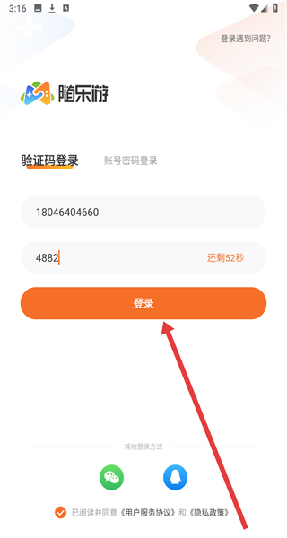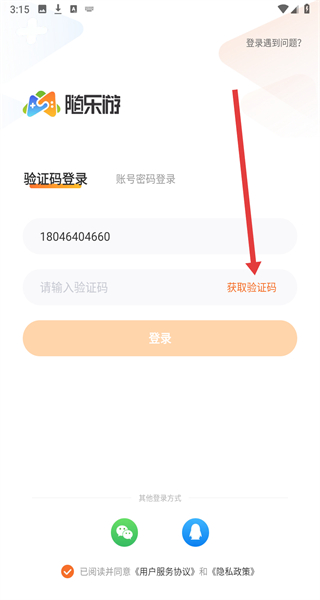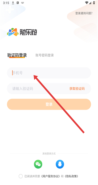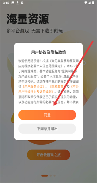 1、在隨樂游APP的“用戶協(xié)議及隱私政策”彈窗點(diǎn)擊“同意”,進(jìn)入登錄界面。