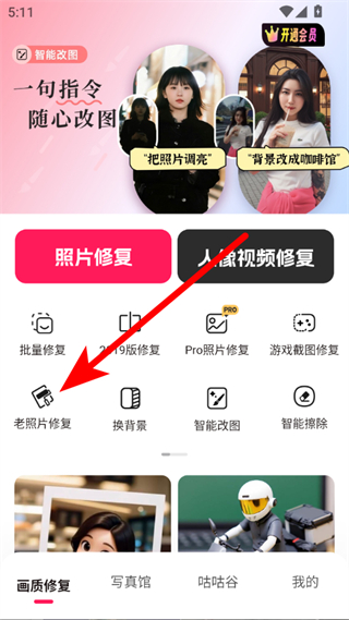1、打開APP后,點(diǎn)擊老照片修復(fù)選項,進(jìn)入老照片修復(fù)功能頁面。