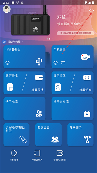 1、打開V導(dǎo)播錄屏應(yīng)用,點擊右上角的設(shè)置圖標(biāo)。