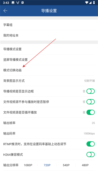3、進(jìn)入導(dǎo)播設(shè)置頁面后,點擊模式切換動畫選項。